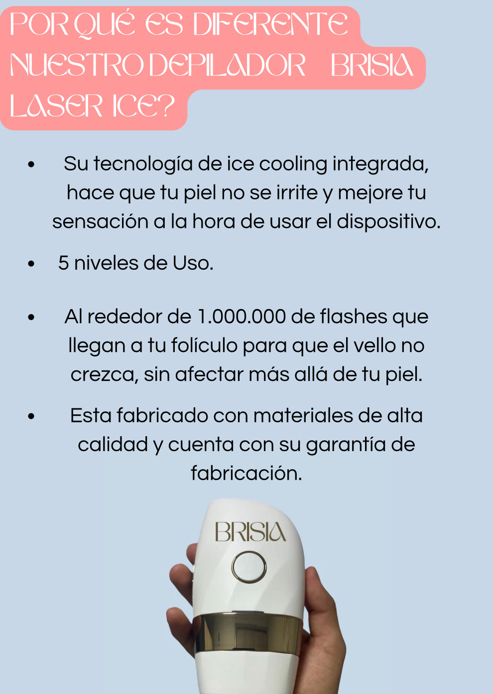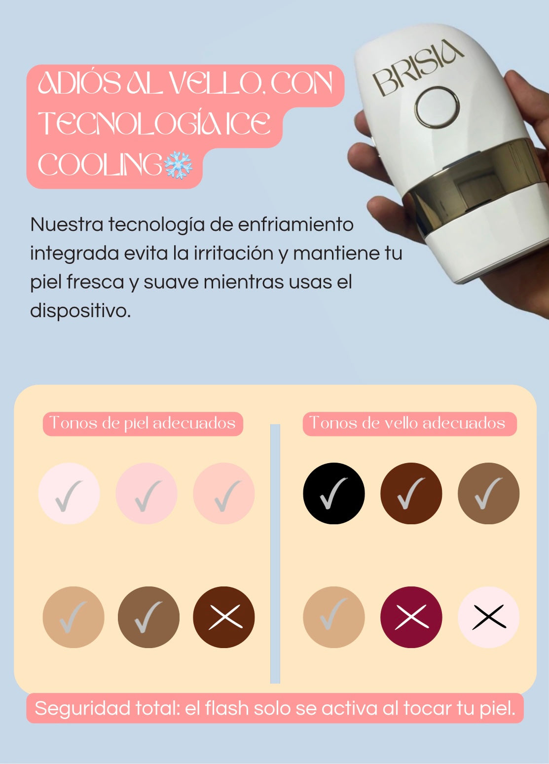 Sí, es totalmente seguro. El Depilador BRISIA está diseñado con sensores que ajustan automáticamente la intensidad de la luz al tono de tu piel, asegurando un tratamiento óptimo y seguro. No es invasivo y la tecnología Ice Cooling reduce significativamente el riesgo de irritación o enrojecimiento.